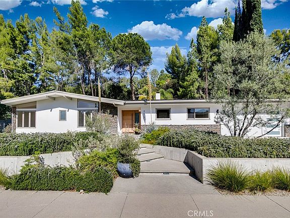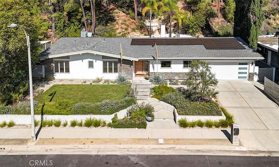 Newly remodeled mid-century modern stunner designed by a renowned architect, nestled on tree-lined street south of the boulevard. Set on nearly 15,000 sq ft of meticulously landscaped grounds, this 4-bedroom, 3.5-bathroom home spans 2,864 sq ft of light-filled living space. Clean modern lines and lush, drought-tolerant gardens frame the exterior, creating a peaceful, private retreat. A custom wood front door opens into a bright, expansive living area with new floors, exposed wood-beam ceilings, and striking double-sided fieldstone fireplace. Walls of glass line the back of the home, opening to a resort-style backyard complete with heated pool, hot tub, outdoor fireplace, view terrace, and playset—ideal for year-round entertaining and family enjoyment. At the heart of the home is the remodeled gourmet kitchen featuring an eat-in island, breakfast bar, custom white oak cabinetry, and stainless steel appliances—perfect for both casual meals and entertaining. The luxurious primary suite is a true sanctuary, boasting spa-like bath with dual vanities and spacious walk-in closet. Additional highlights include owned solar panels, and eco-conscious landscaping for effortless, sustainable living. Don’t miss your chance to call this architectural gem home!