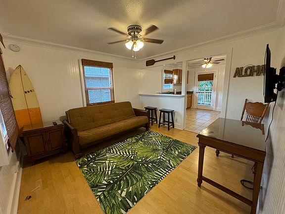 - Exterior features: Bicycle storage, Electricity included in rent, Garbage included in rent, Large lanai, Room to park up to three vehicles, Sewage included in rent, Small storage shed, Two queen beds with linens and bedspreads, Two smart TVs with remotes, Water included in rent, Well-equipped kitchen