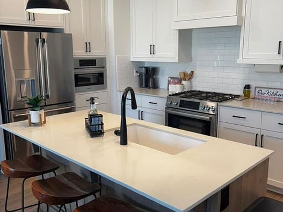 Oversized garageOpen-concept floor planModern kitchenLarge islandQuartz countertopsAmple storageBosch stainless steel appliances