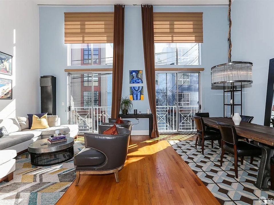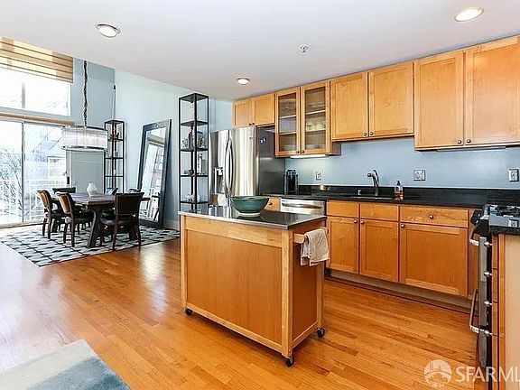 This is one of the largest units in the building. This light-filled live/work loft is located in the SOMA district. Main level boasts a large LIV/DIN area with floor to ceiling height windows, This level features hardwood floors. Kitchen boasts stainless steel appliances, granite counters, recessed lighting, and a pantry/storage. One 1/2 bath on the main level and in-unit washer/dryer on this level. Upstairs features sleeping loft, walk in closet and a full bath with tile and granite. Extra storage in garage and assigned 1 car parking space with easy in and out access. Common roof top deck with city views. Close to transportation.