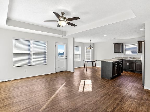 Welcome to this charming 3-bedroom, 2-bath home in Republic! From the moment you pull up, you'll love the adorable curb appeal--complete with a brick accent along the front, bright white shutters, and a warm exterior that instantly feels inviting. Step inside to an airy layout with warm flooring that carries throughout the main living areas. The living room features elegant tray ceilings and seamlessly flows into the kitchen, where you'll find rich dark cabinetry, a center island with bar seating, and a dining space filled with natural light. The primary suite offers its own retreat with tray ceilings, a spacious layout, and an ensuite bath featuring a double vanity. Two additional bedrooms share a full hall bath, making this home as functional as it is cozy. Head outside to a large, open backyard--perfect for play, pets, or hosting summer cookouts. As a bonus, you'll also enjoy access to neighborhood amenities including a refreshing swimming pool. This home truly blends comfort, style, and convenience--don't miss your chance to make it yours!