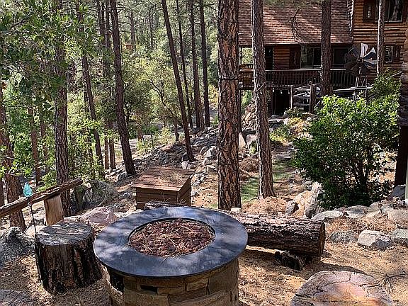 Sharp updated cabin inside and out. This 2 bdrm + Loft (master bedroom plus sitting area/office) and l-3/4 bath sits on a very private .7 acre of tall pines. Oversized 2 car detached garage. Creative studio (painting + music). Activity areas on-site include basketball, darts, archery, horseshoes, bean bag toss game. Frisbee golf nearby. Room for two 25’ RV’s.