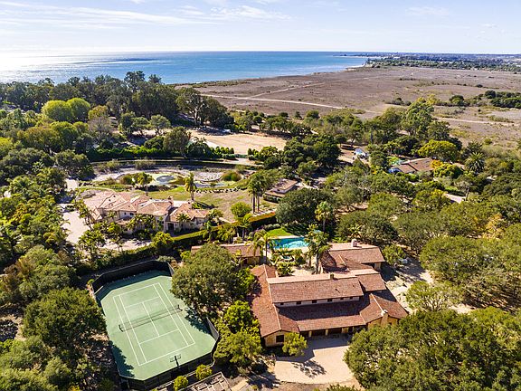 Striking architecture, privacy, indoor/outdoor living and entertaining are offered in a premier Hope Ranch location. The Hacienda/Presidio style estate is nestled in an oak grove welcoming you from the gated entry. The sprawling floor plan includes media rm, music rm, formal dining rm and great rm with soaring vaulted beam ceilings. The primary suite and ensuite office (5th bed) are located on the second level. A separate wing encompasses 3 bedroom suites. Great rm, breakfast nook and spacious kitchen are the perfect place to entertain or relax. Multiple sets of French doors lead to the stunning grounds, Guest House, gym, pool, spa Tennis Ct, Bocce Ct and vegetable garden all set on 2.33 acres. Don't miss the cabana bar and pizza oven! Located close enough to More Mesa to enjoy breath taking sunsets, access the bike path to UCSB or enjoy Hope Ranch private beach.