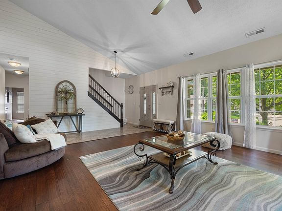 Welcome to this stunning home where modern elegance meets comfort. Enter into a striking family room with hardwood floors, a cozy fireplace, and a vaulted ceiling. The kitchen boasts quartz countertops, stainless steel appliances, a breakfast island, under-cabinet lighting, and a tile backsplash. The main level features a luxurious main bedroom with hardwood floors, tray ceiling, two walk-in closets, and a spa-like private bathroom with a double vanity sink, tiled walk-in shower, and jetted tub. Both the main bedroom and the kitchen lead to a sunroom. Additional spaces include another main-level bedroom and two bedrooms upstairs, offering flexibility. Outside, enjoy a private wooded backyard with beautiful landscaping and a firepit. This home offers sophistication, comfort, and tranquility.