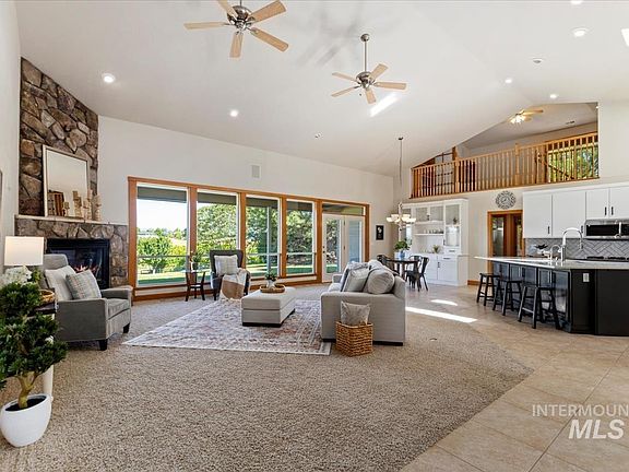 VIEWS! Breathtaking views of Bogus Mountain & rolling hills, this 1 acre stunning property offers the perfect blend of tranquility. Step into the living room with its vaulted ceiling & impressive floor-to-ceiling stone fireplace. The great room is ideal for entertaining, seamlessly connecting to the modern kitchen featuring newer quartz countertops. The master bathroom is a spa-like sanctuary, boasting a relaxing soaker tub, indoor sauna, and elegant quartz countertops. The master suite also includes a cozy fireplace & a spacious walk-in closet. This property is designed for both comfort and functionality. The detached garage and office with a loft area provide ample storage space, and there's plenty of room to park your RV. Outdoor enthusiasts will appreciate the garden bed area, fruit trees, and shrubs scattered throughout the property. Don't miss the opportunity to own this exceptional home that combines luxurious features with a serene setting.