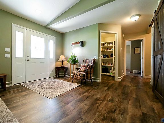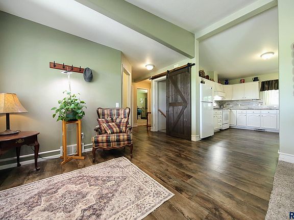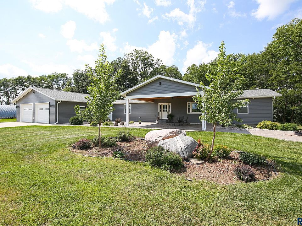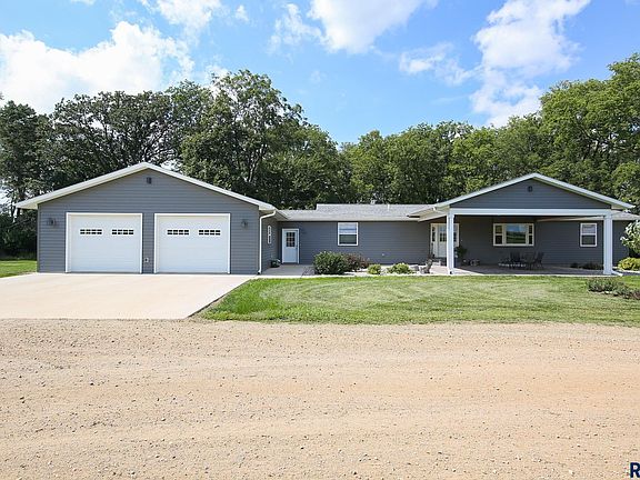 Attention Acreage Buyers! This stunning 4-bedroom, 3-bath ranch-style home offers over 3,300 sq. ft. of living space and sits on 18.43 acres of beautiful land. Enjoy a mature shelterbelt, pasture area, and a large pond. The property also includes a 35x60 heated Quonset with cement flooring, 4 grain bins, and a 48x90 metal building with a heated dog area and partial cement/gravel flooring. The home features a newer roof, metal siding, a large covered deck with stamped concrete and firepit, and a 30x38 attached garage with in-floor heat and drain. A breezeway connects the garage to the house, leading to a vaulted, open living and dining area and a spacious kitchen with ample cabinet space. Main floor also offers laundry, a full bath, and 2 bedrooms, including a master suite with full bath, soaker tub, separate shower, and walk-in closet. The lower level is perfect for entertaining with a large family room, additional bedroom plus one non-legal room, full bath, and storage space.