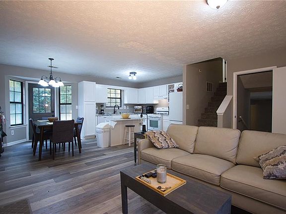 Brick fireplaceBack deckBreakfast roomWhite appliancesWooded oasisWhite cabinetsKitchen island