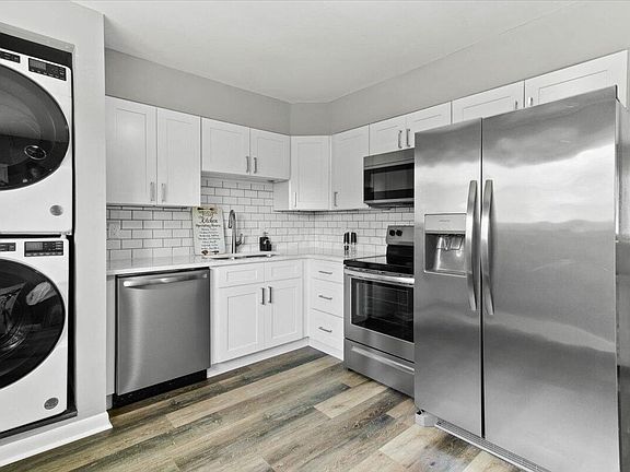 The entry level features a living room complete with a fireplace, an updated eat-in kitchen w/granite countertops and stainless-steel appliances, a convenient stackable laundry area, 2 comfortable bedrooms, and a stylish full hall bathroom.