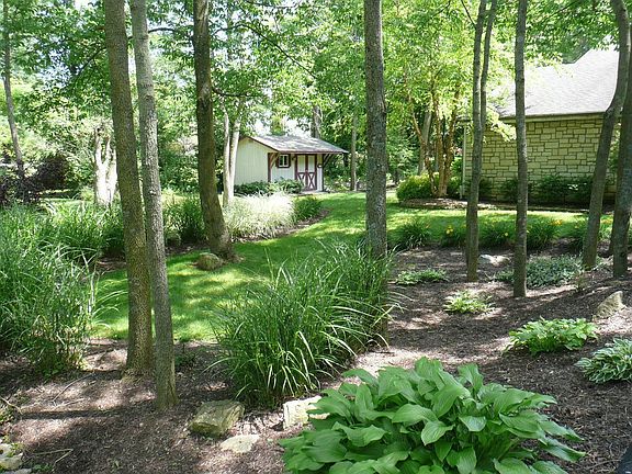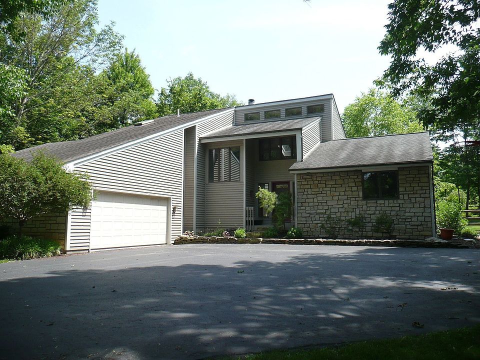 STUNNING Soft Contemporary situated on a one-acre wooded lot with soaring ceilings, transom windows, & sky lights! Fully equipped granite kitchen with tile floors and breakfast bar/island! Vaulted family room with built in desk/bookshelves, track lighting, gorgeous hardwood floors & bay window! Dramatic two-story Great Room with double-sided fireplace and wall of windows! Deluxe vaulted Master Suite with balcony, soaking tub with glass block surround, double vanities, bidet/powder room, and spacious walk-in closet! Finished lower level with a hobby room and rec room/exercise room (adds 700+ sq. ft. to finished space)! Exterior amenities include a circular paver patio with columns, garden pond, large storage shed, and a delightful natural setting with mature trees and a meandering stream! ARCHITECTURALLY STRIKING!