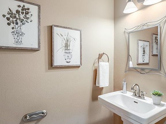 Upstairs, the luxurious primary suite offers soaring windows, a ceiling fan, walk-in closets, and a spa-style bathroom with dual vanities, a soaking tub, and a glass-enclosed step-in shower. Two additional spacious bedrooms with sliding closets share a full bathroom with a tile vanity and extended mirror. A central loft provides flexible space for a home office, playroom, or media area, while the upstairs laundry room with sink adds convenience.