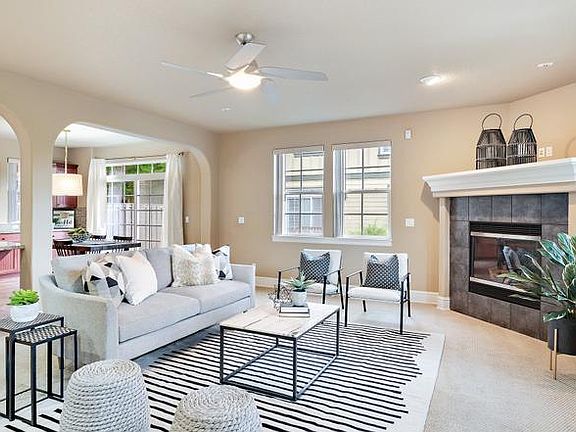 The two level features a bright, open layout with LUXURY VINYL FLOORING throughout the entire HOME with gourmet kitchen and dining area with tiles. The gourmet kitchen boasts a large island with a built-in gas stove and oven, stainless steel appliances including a refrigerator, mounted microwave and dishwasher. Light cabinetry with under-lighting, marble tile backsplash, and a walk-in pantry complete this chef-inspired space. Adjacent is a dining room with oversized windows and a modern light, while the spacious living room offers a built-in fireplace. A convenient half bath completes the main floor.