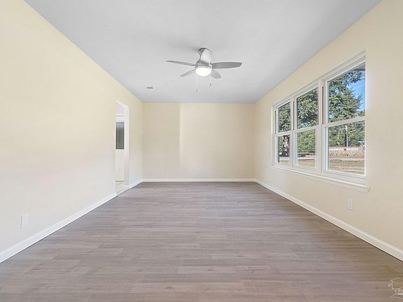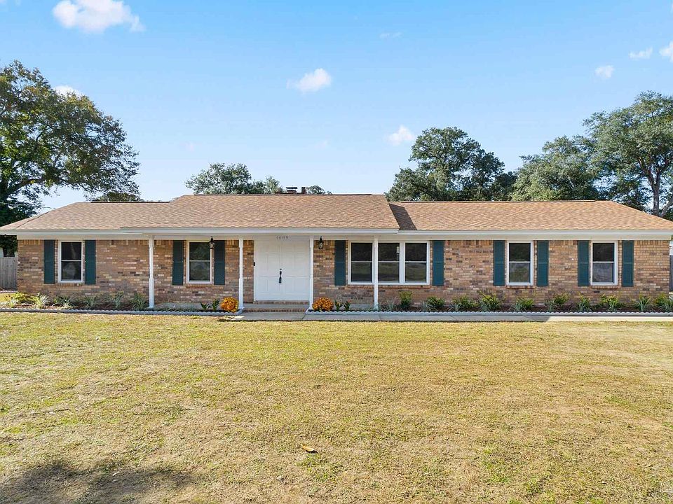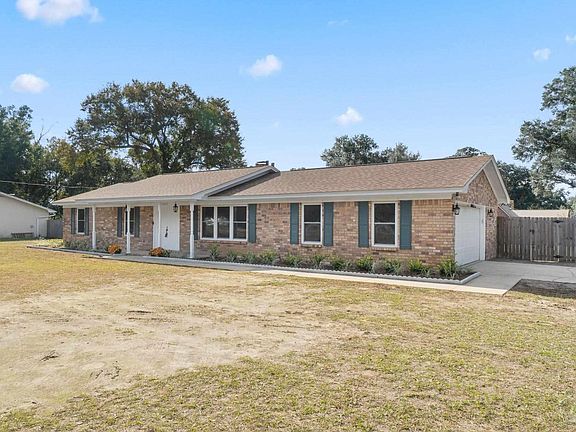 Completely updated and remodeled home situated on a half-acre lot in the heart of Pace. This adorable home has been meticulously updated and improved from the top down and is move-in ready! As you enter into the home under the covered porch, a large formal dining room is situated off the entry way that leads into the spacious kitchen. Featuring Tile flooring throughout the kitchen includes solid wood cabinets, brand new whirlpool appliances, and a large bar area perfect for breakfast seating. The kitchen overlooks the living area that's been equipped with a brick fireplace and includes French doors with built in blinds leading out to the large fenced in back yard. The master bedroom is large with an ensuite bathroom with new vanity and solid countertops, large walk-in shower, and new flooring. The hall bathroom has also been updated with a new tub, vanity, and flooring. The backyard is huge with plenty of room for entertaining and includes a carport area that would be perfect for a boat or trailer and 2 shop storage buildings, and power is available in the larger one!