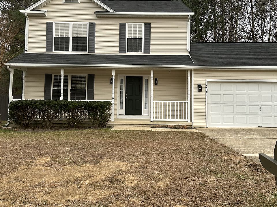 This single family 2 story home has 3 bedrooms and 2.5 baths. Located close to Pax River Naval Air Station, it is located on a cul-de-sac in a quiet neighborhood with no HOA. Pet friendly, it also features a fenced in yard with a deck, a front porch, and a 2 car attached garage. The home features Pergo wood laminate flooring on the main level, carpeting on the upper level. The modern looking kitchen has an island, tile backsplash, and a dinette area with new flooring. The main level also features a laundry facility with washer/dryer included, a half bath, formal dining room, and family room. The upper level includes the primary bedroom with walk in closet. The primary also has an en suite bathroom with a garden tub. There are two additional bedrooms, one with built in shelving, and another full bath. Public water, gas stove, electric ac/heat. Trash service and landscaping not included.