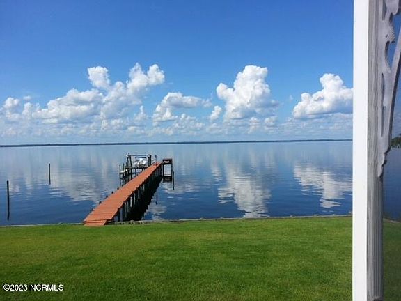Spacious open concept floor plan w multiple outdoor living areas to soak in these views every day! Three bedrooms each w private bath. The owners suite opens onto a large balcony overlooking the Albemarle Sound. Each day offers unique sights. The kitchen and living areas offer water views too plus a screened porch; perfect outdoor space.. The triple garage offers plenty of room for vehicles & storage and above is a game room/bar overlooking the water as well. The pool table conveys! This property has a vinyl bulkhead, pier leading to a boat lift and lounging area; perfect for taking in a sunset or catching some fresh fish.