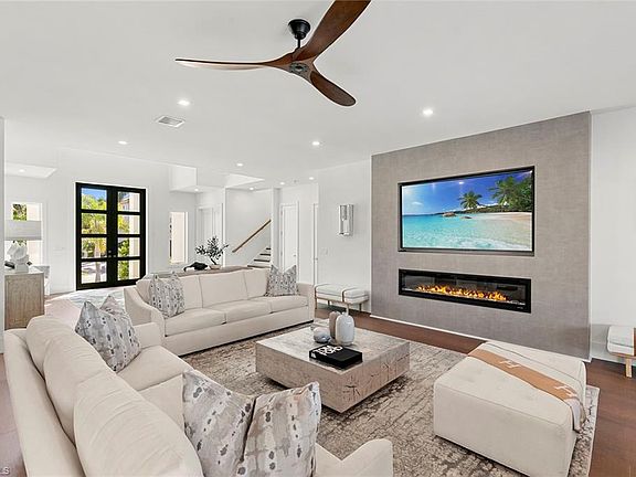 A stunning waterfront masterpiece in Conners at Vanderbilt Beach, this newly complete 2023 custom residence captures the essence of modern coastal living. Thoughtfully designed for today’s lifestyle, it offers over 5,500 square feet of light-filled living space with six bedrooms (or flex spaces), five full and one half baths, and an effortless indoor-outdoor flow. The expansive great room and gourmet kitchen, anchored by a striking waterfall island and sleek cabinetry, set the stage for elegant entertaining, while wide-plank wood flooring and designer finishes enhance the home’s contemporary style. The main-level primary suite provides a serene retreat with a spa-like bath and access to the backyard oasis. Upstairs, a lofted family room and guest suites open to a covered balcony overlooking the canal. Outside, enjoy a negative-edge pool with a spillover spa and sun shelf with lounge chairs, framed by tranquil canal views. A built-in grill and generous lounging and dining areas create the perfect setting for outdoor entertaining. Boaters will appreciate the new dock and 16,000-pound lift offering Gulf access. Additional conveniences include a private elevator, laundry rooms on each floor, and a circular drive with custom turf inlay. Move-in ready to enjoy this season, with furniture package negotiable. Ideally near Vanderbilt Beach, LaPlaya, the Ritz-Carlton, and Mercato’s premier shopping and dining, this residence blends luxury, comfort and an extraordinary Naples waterfront lifestyle.