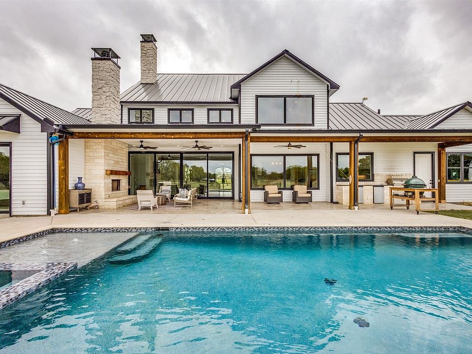 This stunning farmhouse on 12.32 acres with backyard oasis & 3750sqft shop epitomizes the perfect fusion of rural tranquility & modern luxury. Main home is 4775sqft & offers 4 large bedrooms 4 ensuite baths, open concept living space, cathedral ceilings, white oak wood floors, gas fireplace, exercise room, safe room, picture windows, additional half bath, game room & dog wash station in utility. Gourmet kitchen boasts side by side built in fridge, 6 burner gas cooktop, dbl oven, large Quartzite island, & full-service wet bar. Spa like primary bath has walk in shower, soaking tub, & HUGE closet with custom built ins. Expansive covered back patio features travertine tile, ceiling fans, fireplace, heated pool & spa, & outdoor kitchen. Shop has 5 14FT rollup doors, pellet stove, 600sqft studio apartment, & plenty of space to park multiple RVs & toys*AG EXEMPT*SOLAR*SPRAY FOAM IN SHOP & MAIN HOME*Cross fenced. 2 loafing sheds, 2 pens, chicken coop, 2 ponds, cattle grids, & perimeter fence*