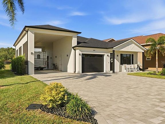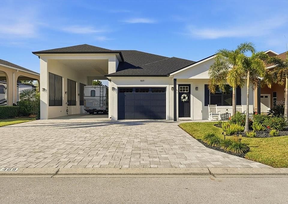 This home is move in ready! If you are looking for the perfect winter getaway or ready to move to sunny Florida than this is the one. Located in the sought after community of Mt. Olive Shores North, an upscale RV community. This home was built in 2023 with high end finishes and is in spectacular condition. With a second bedroom and bathroom for guests to enjoy some privacy when visiting. The primary bedroom and bathroom are conveniently located towards the back of the home. The laundry room is located in the primary suite for convenience. Sliding glass doors give you a beautiful view to the patio area from both the living room and the primary bedroom. With the sliding doors completely open the size of your entertaining space just doubled. The RV port is extra wide with plenty of room to park your motorhome and an additional vehicle or golf cart. Call today for an appointment to see this beautiful home.