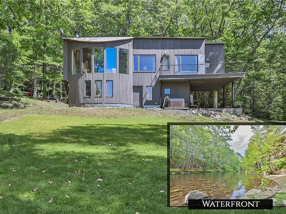 Nestled in a serene and private setting, this exceptional custom contemporary home offers breathtaking panoramic mountain views and picturesque waterfront access. A long, private drive leads you to this unique residence and its stunning surroundings. Upon entry, you're greeted by a spacious foyer anchored by a bold staircase with a custom metal railing that extends through the second level. The open-concept living area, with its striking coved ceilings, seamlessly integrates the kitchen, dining, and living spaces, all while showcasing the sweeping vistas of Overlook Mountain. Soaring ceilings, warm maple wood floors, and a cozy wood-burning fireplace enhance the inviting atmosphere, complemented by an abundance of floor-to-ceiling windows. The primary suite, also located on the second level, includes a full bath and deck access, where you'll find an outdoor shower and ample space for alfresco dining or stargazing. The lower level presents immense versatility, currently serving as a home office/guest room. This space can be adapted for a multitude of uses, whether divided into two additional bedrooms as originally planned or creatively utilized using the existing stubbed plumbing its own exterior entrance, and 220-amp electrical outlet. Additionally, there is a full bathroom/sauna as well as a laundry closet on the lower level. The outdoor amenities include a private Jacuzzi, ensuring relaxation, as well as frontage on Plattekill Creek which can reach 5-6 feet in depth depending on rainfall. This remarkable property combines privacy with convenience, offering an unparalleled living experience. Recent updates include a Central Heat Pump offering the highest efficiency heat and air conditioning working from a duct system that creates consistent heating and cooling throughout the home. The home has been painted in-and-out. The access to the Plattekill Creek has been nicely improved, generating in the southern slopes of the Kaaterskill High Peak the crisp water flows and offers great swimming and fishing. Address is actually 469 Old Powdermill Rd, however due to GPS navigation issues, we have listed as 469 Powdermill Rd.