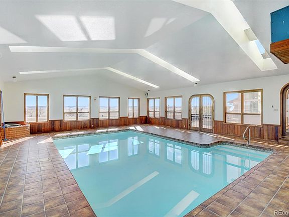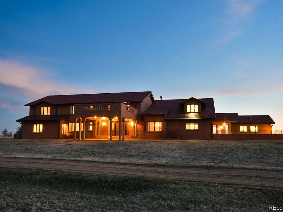 The estate you've been looking for w/ a grand main home, smaller second residence, privacy, & good pastures on 185 acres of prime Colorado ranching property*Sitting on the highest point of the property, you're immediately drawn to the architecture & grandeur of this custom built estate*This home is built solid & all the little details are there*Just some of the highlights are: An indoor pool; elevator; an 8 column porte-cochere entry; curved staircase; 17' ceilings in the great room w/floor to ceiling windows to watch the amazing sunsets & mountain views; exquisite oak cabinets, built-ins, & crown molding throughout the home made from oak milled on the property; 8' wood paneled sliding doors entering the great room; a stunning wood burning fireplace w/ 6' high mantle; a loft overlooking the great room*Truly an entertainers dream- a wet bar area, an elegant spacious formal dining room, a kitchen which boasts double ovens, a 6-burner stove, 2 pantries, eating area & an additional breakfast nook w/beamed ceilings*Several private court yards, a green house & separate fenced garden area*Large bedrooms w/private baths & walk-in closets*A soundproof bedroom in the massive finished basement*Mud room w/hat & boot racks*Laundry room w/utility sink, cabinets & built in ironing board*An oversized 4 car attached finished garage w/4 dog kennels, dog washing station, & 2 gas heaters*Sitting on fenced pasture, this land can be used in a multitude of ways*Most recently used as a successful cattle ranch*Enjoy hunting deer, antelope, & game birds on the property as well*The original farm house built in 1943 remains on the property & is currently being rented out*Several additional outbuildings included-another 4 car garage, tool sheds, loafing sheds & piped corrals*This is a beautiful property situated on rolling hills & grasslands* Must see in person to appreciate all the custom details.