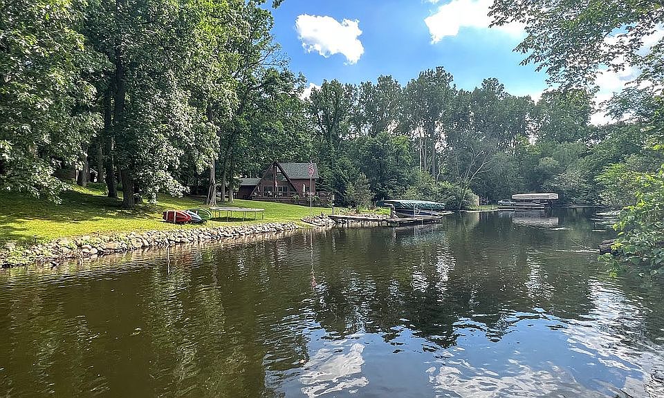 Location, Location, Location! Here's your chance to own this incredible custom A-Frame home on the highly sought after Portage Chain of Lakes. Over 300 feet of waterfront surround this beautiful private lot. The canal quickly opens up to enjoy the all sports chain of 9 lakes including Zukey Lake, Strawberry Lake, Gallagher Lake, Baseline Lake and more! This home has a 2 car garage, shed, and has been completely remodeled/updated with granite counter tops, live-edge bar, pot filler, drink fridge in bar, glass dual shower with jets, in-floor radiant heating with 2 zones, wood burner, new boiler (2021), custom stone wall with gorgeous water views, and more. The triple (3) sliding glass doors open up to the raised wrap around deck that overlooks the tranquil large backyard. This home captures that "up-north" feeling that everyone loves, but without the drive. Lake never freezes, therefore, there is never a need to take out the dock or boat hoist. Built-in concrete fire pit, and your shore is protected by the 45 tons of boulders. This won't last long!