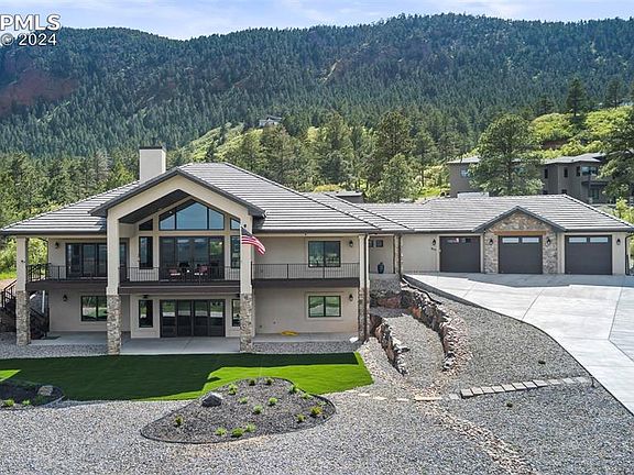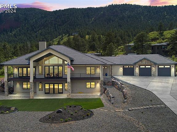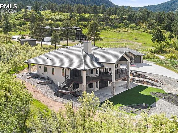 Your own paradise at the end of a cul-de-sac near national forest! Built in 2021, this like new home in the desirable Red Rock Reserve neighborhood has views on all sides! Vaulted ceilings, large rooms, high end finishes and attention to detail throughout this home are admirable! The gorgeous floors are blonde hickory, cabinets are alder and all baths have heated floors! On the main level, you will enjoy a gourmet kitchen with GE Monogram stove, double ovens, 48" gas stove with griddle and custom hood! The kitchen also has quartz counters, under and over cabinet lighting, views of Raspberry Ridge from the sink and cabinets with pull outs on both sides of the large island! The dining area is impressive with room for large gatherings, more views of the national forest and walk out to the oversized back covered and sun patios! Your family room has vaulted ceilings, a large stone fireplace and a wall of windows that lead to the full wrap around covered front deck with views of Elephant Rock and the mesa tops! The main level master has space for seating and also walks out to covered deck for evening relaxing! The barn door in the master bedroom leads you to your spa like master bath with a spacious shower, double doors to a huge closet and walk out to the back patio with views of the national forest! The main level has another bedroom being used as an office with wood floors and built in dresser/shelves. The mud room provides you with a sink, mud bench and laundry room/pantry that can hold a second fridge. Your 1500 SF three car garage has space for shop, installed flooring and 30 amp for car lift. The basement has three more large bedrooms, two baths, full size wet bar, golf simulator available for sale, safe room and work out room. Basement walks out and has great views! All this in your private paradise for true Colorado living! Close to charming Palmer Lake and National Forest hiking areas!