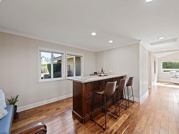 Magnificent Weibel custom home on half-acre premium lot offers sophisticated luxury in 4,598 sq. ft. Featuring 5 bedrooms, 3.5 baths, and 3-car epoxy-finished garage. Gourmet kitchen boasts custom cabinetry, granite surfaces, walk-in pantry, and new electric cooktop with breakfast nook capturing Bay views. Family room with vaulted ceilings and gas fireplace connects to covered patio. Primary suite includes walk-in closet, sitting area, and updated designer bath with dual sinks, glass shower and skylight. Four additional bedrooms with walk-in closets, one with private balcony. Formal living area features soaring ceilings and stained-glass windows; dining room showcases crystal chandelier and wet bar. Versatile in-law quarters with separate entrance includes kitchen, wine cellar, and full bath. Resort-style backyard with B&W speakers, stone pavers, panoramic views, mature landscaping and fountain pond. Premium features: Acacia hardwood, crown molding, dual-pane windows, fresh paint, updated secondary bath, efficient HVAC. Top-rated Weibel/Horner/Irvington schools. Minutes to 680/880, BART, and Silicon Valley tech companies.