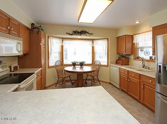 This one owner ranch walkout is in immaculate condition! Easy low maintenance living. Inviting front foyer leads you into the lovely great room with catheral ceilings and skylights. Large picture window overlooking the beautiful private backyard and slider doors leading to brand new deck partially covered. Open and spacious kitchen with snack bar, pantry with pull out drawers, and casual eating area. Master suite features walk in closet and large full bath. Main level also includes a 2nd bedroom with double closets, 2nd full bath, and large deep closet with laundry hook ups. Currently laundry is in the basement. You'll appreciate the nicely finished walkout basement with rec room, office, 3rd bedroom with walk in closet, 3rd full bath, and storage.