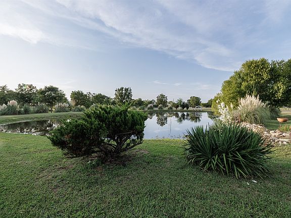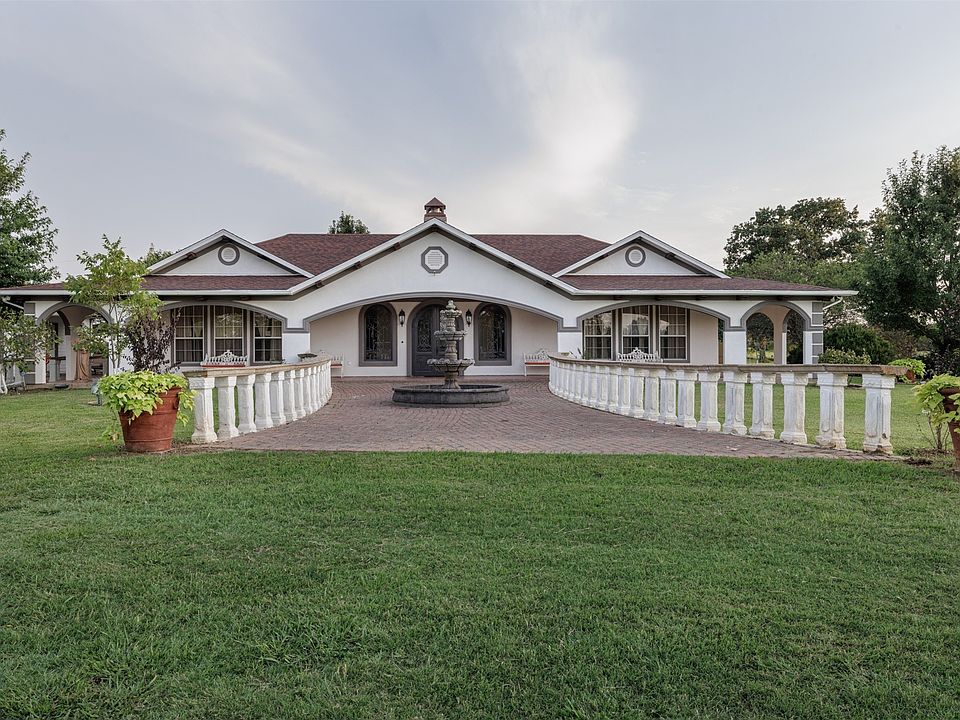 Elegant living space, two fireplaces, spanish-inspired details like arched doorways and tile accents. Most rooms open to courtyard with water fountain and leads to swimming pool. Homes features wrap around porches and large covered back porch. Four stall garage with attic storage. Metal shop building with large overhang on both sides. Water well keeps pond level full year around and irrigates the pecan trees. Homes features wrap around porches and large covered back porch. Four stall garage with attic space. All information is approximate, buyer and buyers agents to verify