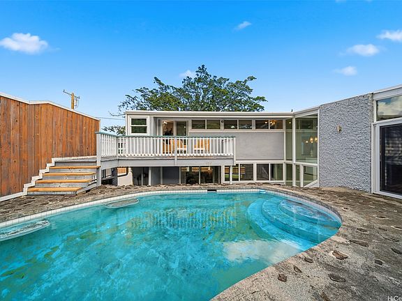 Tucked in Lulani Ocean, perched above Kaneohe Bay, this mid-century modern gem blends islander living with timeless design. Not your cookie-cutter home, it embodies character, flow, and spaces that just feel good. The kitchen and baths have been updated over the years and the indoor/outdoor connection makes entertaining effortless. Multiple lanais open to cool breezes, mountain views, and a lush and expansive 10,710 sq ft lot that might be perfect for that ADU you've dreamt about. Downstairs, a separate living area with its own entrance offers flexibility for extended living or creative space. Lounge by the pool, take in the Koolau's, or launch your kayak from nearby Laenani Neighborhood Park. Two-car garage plus extra parking and generous storage make this one both functional and fun. A true coastal lifestyle, without the oceanfront price tag.