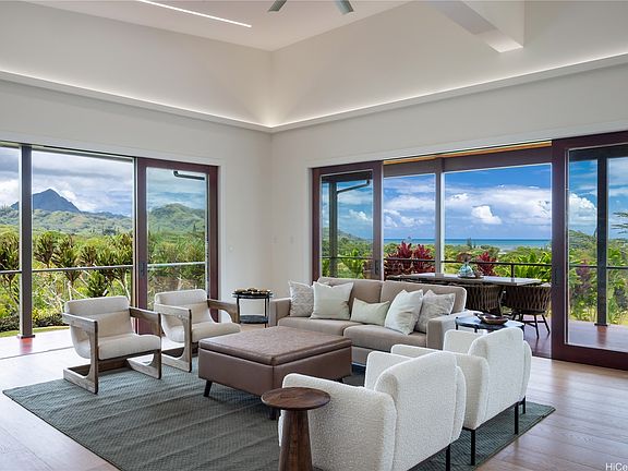 Prominently situated at the base of the Ko‘olau Mountain, a newly built Luxury Country Estate is a rare opportunity for a discerning Buyer seeking views, land, location, & privacy. Spanning over 4 acres above a neighborhood of Cacao Farming, this private Retreat offers breathtaking panoramic views of the ocean, and lush mountain cliffs. A thoughtfully designed residence showcasing soaring ceilings, mahogany framed glass doors from floor to ceiling for seamless indoor-outdoor living. Custom finishes include monkeypod stair treads, tigerwood lanais, custom LED recessed lighting (converts to 12 volts), and 8’ doors throughout. The Chef’s kitchen features 2 sinks, an oversized island - perfect gathering area for the Holidays or entertaining, a 6-burner range/2 ovens with pop-up hood. Primary suites, 1 on each level, offer spa-inspired bathrooms, walk-in closets and a private balcony upstairs. SUSTAINABILITY meets SOPHISTICATION. Owned PV system, tropical landscaping & gated driveway entry. BONUS unattached 900sf workshop. Tucked away for serenity yet minutes from conveniences, this is Hawai‘i living at its finest. Conveyed w/TMK 1-4-7-5-41-1/MLS #202519988.