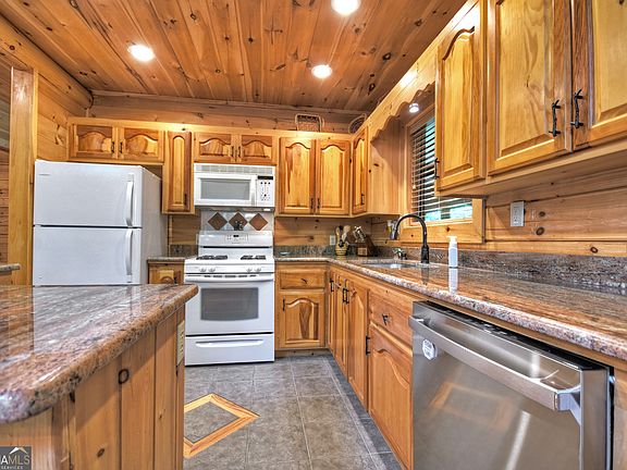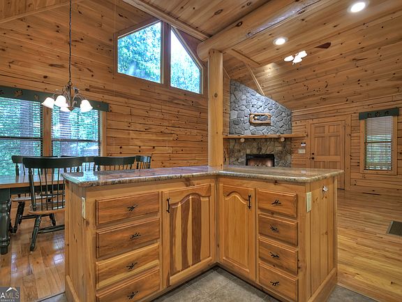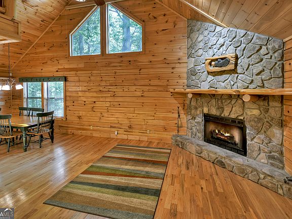 Discover your dream retreat at this enchanting 3-bedroom, 3-bathroom authentic log cabin nestled within the serene landscapes of Blue Ridge...This meticulously maintained home offers an ideal blend of rustic charm and modern updates, ensuring a cozy yet sophisticated living environment. The heart of the home features a majestic stone fireplace flanked by soaring ceilings and rich wood interiors, creating an inviting atmosphere that extends throughout the property. Large windows bathe the space in natural light, enhancing the warm, woodsy aesthetics. Each bedroom, including the primary bedroom & loft area, promises spacious comfort, while updated tile showers add a touch of elegance. Outdoor living is elevated with wrap-around porches and decks, perfect for relaxation or hosting gatherings. The property includes a robust fire pit area for cool evenings under the stars, and a whimsical, large treehouse-complete with a screened-in bunk area, fire pole, and zip-line-offers adventurous fun for all ages.The full finished terrace level features guest quarters and additional storage, complemented by a practical carport, a workshop area, additional covered parking with outdoor storage, plus a garage for motorcycles or outdoor gear. The property's delightfully landscaped yard blends seamlessly with its natural surroundings, increasing its curb appeal. Just a stone's throw from the Toccoa River and surrounded by numerous hiking and biking trails, the cabin is also a short drive from the historic downtown area, offering both privacy and accessibility to local attractions. Whether you're seeking a profitable vacation rental or a family home or retreat, this property is a true gem that encapsulates the best of mountain living.