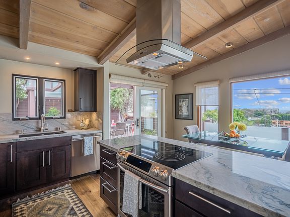 180 degree ocean views of the Pacific Ocean in this quaint, beach community in Southern California. Enjoy endless sunsets from the cozy comfort in this writer's cottage with expansive deck over looking the ocean from large, picture windows in the kitchen, living room and office/bedroom of this home. Recent upgrades to the master bedroom, kitchen, bathrooms, and laundry area provides up-to-date living with stainless steel, granite, walnut hardwood floors and two natural stone fireplaces. The all wood ceiling brings the feeling of luxurious comfort. This historically quaint beach house is perfect for investment, second home or primary retirement living. You have a short walk to Encinitas restaurants, Moonlight Beach, grocery store, and the Coaster train.