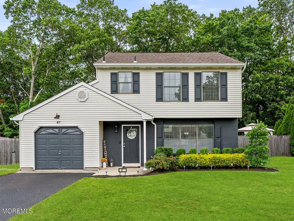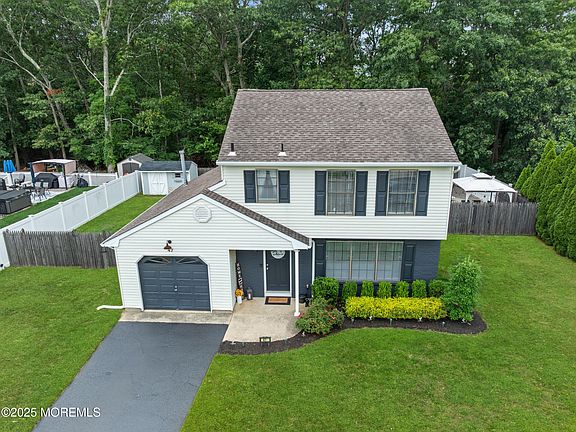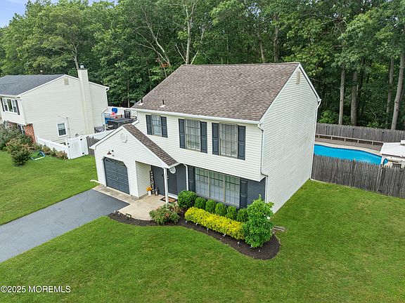 Located in the desirable Ramtown section of southern Howell, this updated 3-bedroom, 1.5-bath Colonial backs to private woods and features a fully fenced yard with a heated Gunite pool, deck, grassy area, and oversized shed your own backyard retreat. Inside, enjoy a renovated kitchen with white shaker cabinets, quartz countertops, custom backsplash, and stainless steel appliances. The great room and dining area feature hardwood floors, recessed lighting, and a modern, neutral vibe. A half bath, laundry room, bonus room, and partial garage complete the first floor. Upstairs, the primary bedroom offers jack-and-jill access to a beautifully remodeled full bath. All bedrooms include new doors and ceiling fans.Close to major roads, shopping, dining, and top-rated schools.