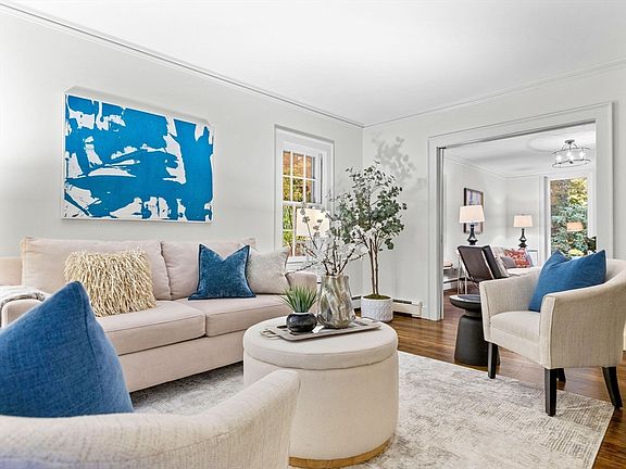 This charming 1928 Cape features spacious rooms, high ceilings, and beautiful hardwood floors throughout the first and second floors, perfect for both comfortable living and entertaining. The thoughtfully landscaped yard offers privacy, with a scenic path leading to a shaded patio and garden. The living room, with its cozy fireplace and French pocket doors, opens to a bright family room with a wall of windows that brings the outdoors in. The kitchen includes granite counters, stainless appliances, newly installed hardwood floor, and leads to an adjoining office. A large dining room, mudroom, and half bath complete the first floor. Upstairs, the master bedroom has 2 walk-in closets and a full bath with a jetted tub. The second and adjoining third bedroom or office share a hall bath. Two finished lower-level rooms provide additional living or play space. With a two-car garage and an ideal location near Brown Field, train stations, and local shops, this home is a true gem.