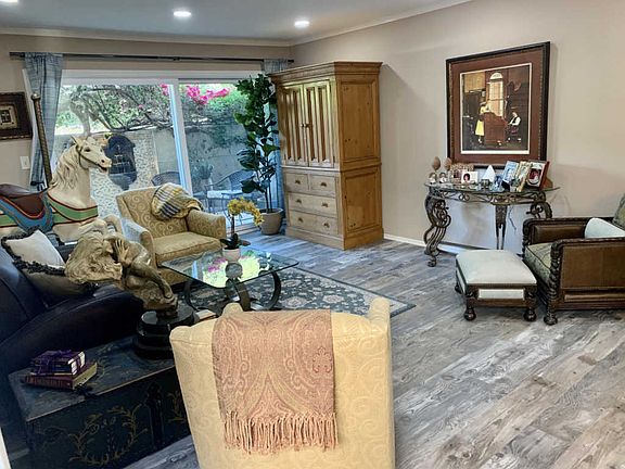 Fabulous remodel with NEW cabinets, granite, hardware, flooring throughout the unit. Enlarged kitchen and new stainless steel appliances. Large bathroom mirror, and cabinets added. Limestone patio with 3 tier wall fountain that resonates throughout the unit has lush landscaping with new irrigation. Newer windows. This condo really feels like a home. Well located ground floor unit.