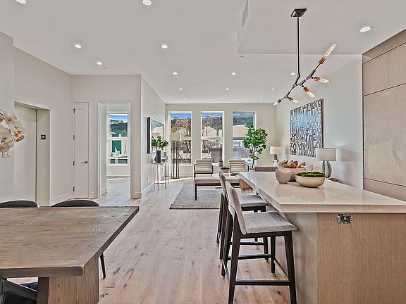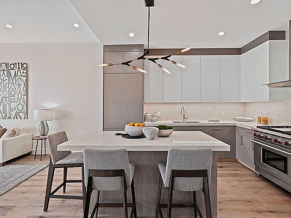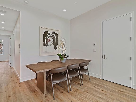 The building facade is a stunning showcase of floor-to-ceiling windows. The penthouse, in particular, boasts wall-to-wall picture windows that overlook the charming tree-lined street. Inside, you'll discover an impressive Great Room with an open floor plan encompassing a modern kitchen and spacious living room. Additionally, a large terrace awaits, providing the ideal setting for entertaining friends or simply unwinding in style.