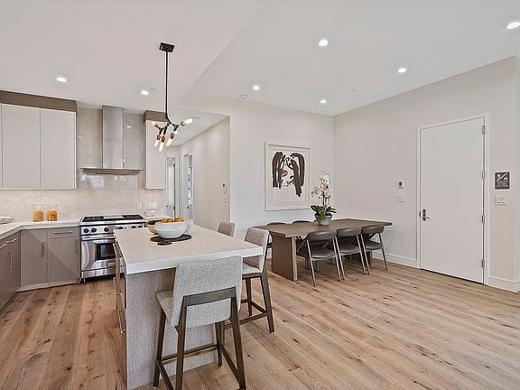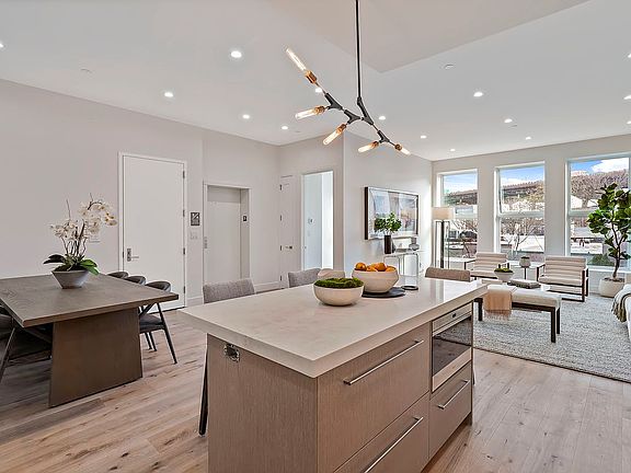 The building facade is a stunning showcase of floor-to-ceiling windows. The penthouse, in particular, boasts wall-to-wall picture windows that overlook the charming tree-lined street. Inside, you'll discover an impressive Great Room with an open floor plan encompassing a modern kitchen and spacious living room. Additionally, a large terrace awaits, providing the ideal setting for entertaining friends or simply unwinding in style.