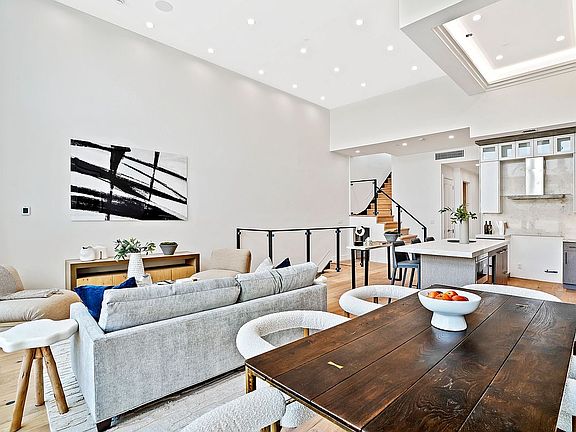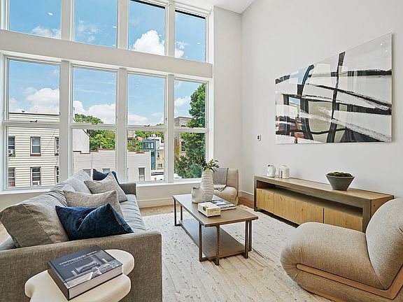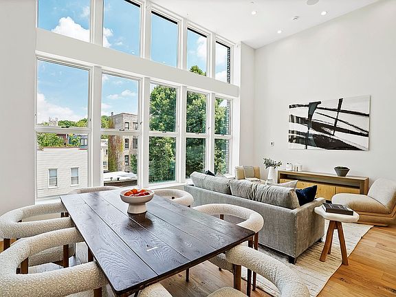 The building facade is a stunning showcase of floor-to-ceiling windows. The penthouse, in particular, boasts wall-to-wall picture windows that overlook the charming tree-lined street. Inside, you'll discover an impressive Great Room with an open floor plan encompassing a modern kitchen and spacious living room. Additionally, a large terrace awaits, providing the ideal setting for entertaining friends or simply unwinding in style.