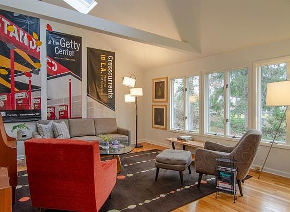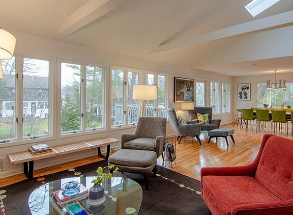 High-style and amazing space await you in this fabulous MId-Century ranch. From the moment you enter this thoughtfully updated and flawlessly appointed home, you are mesmerized by the open floor plan and light. Dream kitchen w a contemporary flair features custom walnut and laminate cabinets, quartz counters and premium SS appliances is large enough for a family room section. Open to the dining room, the living room boasts a vaulted ceiling w skylights and exposed beams. Easy access to new rear Trex deck overlooking the level, park-like property. Master suite offers an updated bath and closets galore; 2 additional bedrooms and hall bath round out the 1st floor. CAC. Walk out lower level w rec room features WBFP; 4th BR w full bath; laundry rm; 2 car garage w bonus storage room. One block to Village and NYC trains.