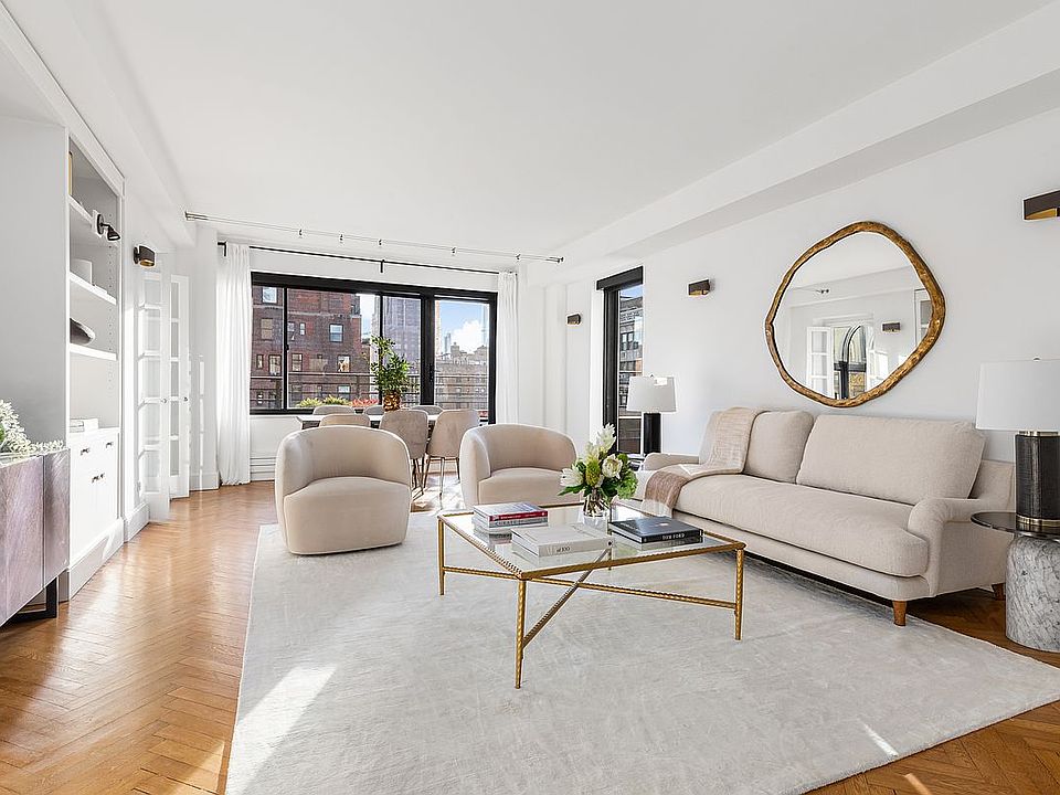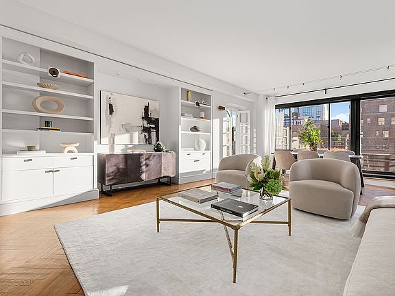 A proper foyer, accented with built-ins, two closets and a powder room, greets you and opens into the sprawling living room, bathed in natural light. Floor to ceiling windows capture open sky and city views with both southern and western exposures. A wall of custom built-ins anchor the space and gorgeous herringbone hardwood floors enrich every room. A designated dining area allows for easy entertaining against a backdrop of sunsets and skyline views. Step out onto either the southern or western private terrace to enjoy your morning coffee or evening cocktail as you gaze upon downtown vistas and glimpses of Central Park.