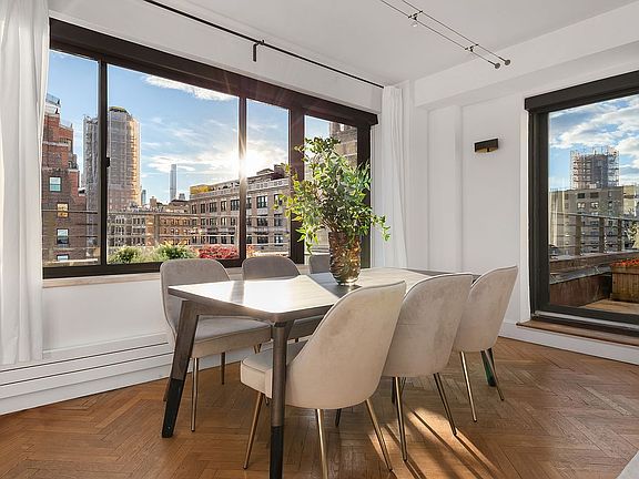 The updated and windowed galley kitchen is tastefully appointed with black granite countertops, recessed lighting, and a suite of stainless steel appliances including a KitchenAid stove, LG dishwasher, and a Sub Zero refrigerator. This chef’s kitchen is accessed through beautiful French doors and features an enviable amount of storage and counter space. An in-unit Miele washer / dryer provides maximum convenience. A designated casual dining area with solarium elevates this space.