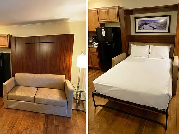Christie Lodge offers a cozy retreat with spacious one-bedroom suites located in the heart of Avon. Each suite features a queen bed and a living room with a queen Murphy bed. The suite also includes a kitchenette, gas fireplace, and private balcony. Guests enjoy resort amenities like outdoor heated pools, indoor and outdoor hot tubs, a fitness center, and guest laundry facilities.