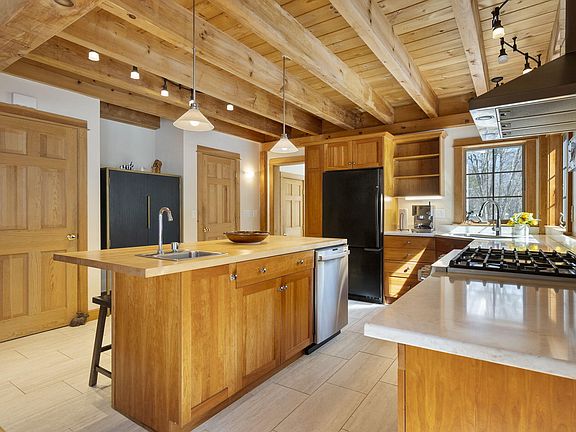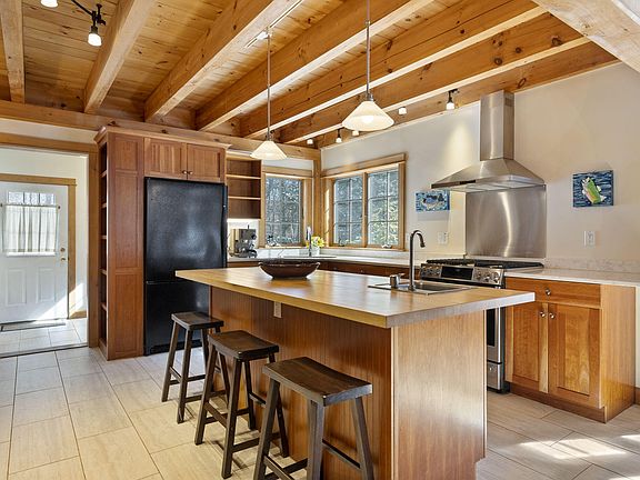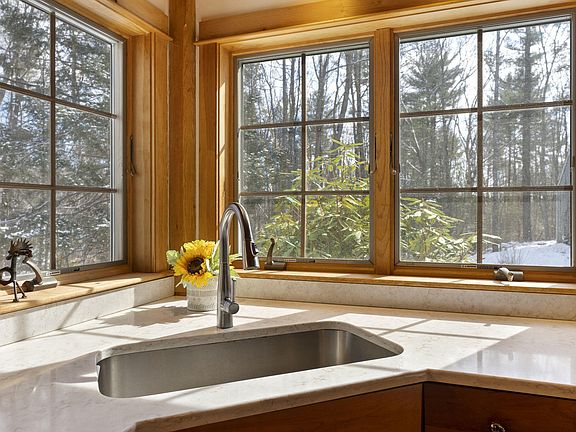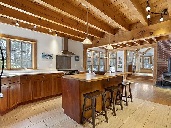 An outdoor enthusiast's dream location in the historic coastal town of York Maine! Situated on a dead end road just steps from the trail heads of Kittery and York water districts, this home has easy access to thousands of acres of protected woodlands and trails all the way to Mt. Agamenticus and beyond. Whether you enjoy hiking, mountain biking, snow shoeing, cross country skiing, or trail running, this property is sure to check the boxes for location! Just minutes to the York Beaches for surfing, sunbathing, or a walk in the sand or head down to the York River for kayaking or swimming. This area has it all while being just a short drive to Portsmouth NH. This sun drenched custom post and beam style home embodies all that comes to mind when thinking of Maine. This 3 bedroom home takes advantage of its southern exposure with an open concept design that is topped with classic features. A kitchen you'll love to cook in with beautiful quartz countertops, full size pantry, tile floors, and an oversized island with butcher block top and a prep sink. The kitchen flows directly into the dining area and its large wall of windows with hardwood floors and a classic wood stove and radiant floor heating to keep you toasty on those cool days. The family room with its cathedral ceilings centers around a stunning Rumford style fireplace. From here you have easy access to the home's sunroom or expansive deck overlooking the yard that features mature native landscaping. With 1 bedroom on the first floor and 2 on the second there is no shortage of space no matter what you are looking for. And of course, plenty of storage in the full basement and oversized gardener's shed. Home currently has a 2 bedroom septic system that can easily be enhanced. Design plan to expand system in hand.