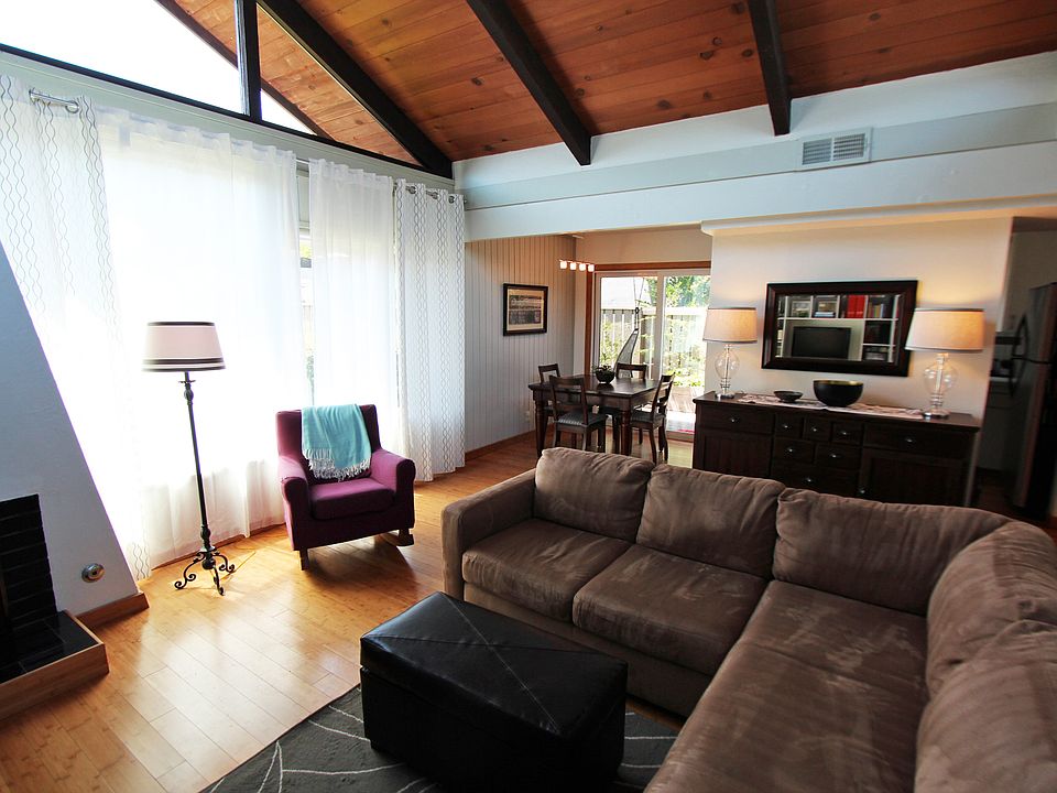 Rare, single level townhouse with only one common wall--feels like a single family home. Open concept living area with soaring ceilings and abundant natural light. Updated kitchen and master bath; inside laundry; dual pane windows and sliding door, bamboo flooring throughout, recessed lighting and freshly painted interior. Sunny patio with gate leads to lovely lawn and swimming pool. Attached one car carport with large storage closet. Excellent location just one block to Creekside park and Stevens Creek Trail. Stroll/bike to Google, Google Children's Center, Symantec, and new elementary school beginning construction soon. Easy access to downtown Mountain View, CA-85 and major commute routes.