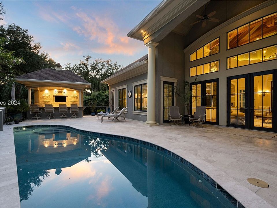 EXCEPTIONAL! A standalone/premier property just a half mile from the beach at the end of a quiet cul-de-sac. A unique combination of privacy & quality! Exquisite detail, never rented, beautifully decorated, high-end furnishings, and single-level living! Featuring exceptional millwork & craftsmanship, 27' ceiling, impressive trusses, imported (wide plank) oak floors, Ashler stone, multiple fireplaces (remote), heated floors in (2) owner suites, 8-car (finished) garage, elevator, high-end sound system, elevated (heated) pool/spa, outdoor kitchen, butler's pantry, 2015 Winner of 3 Lighthouse awards Best Kitchen, Best Exterior, and BEST OVERALL!