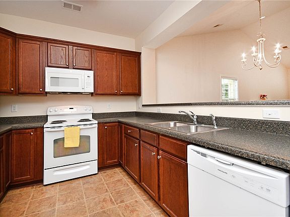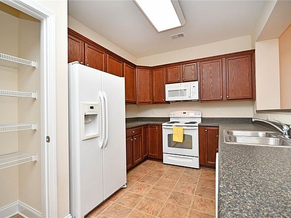 Inside, you'll find an open floor plan with soaring cathedral ceilings and recessed lights, creating a bright and welcoming space. The kitchen is fully equipped with a range, microwave, dishwasher, refrigerator, and pantry closet—ideal for everyday ease. The spacious primary suite features a tray ceiling, large walk-in closet, soaking tub, separate shower, and dual vanities for some extra elbow room.