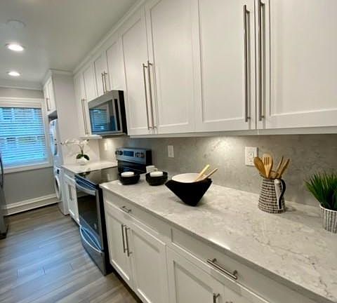 Shaker-style white cabinetryStainless steel appliancesHi-hat lightingCustomizable closet systemUnder cabinet lightingLuxury interiorsVinyl plank flooring