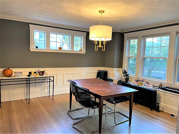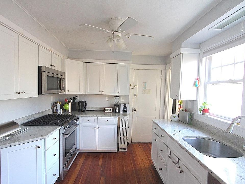 On a quiet residential street, this first floor, updated ~1,700 sq ft condo quality space offers tasteful finishes and three bedrooms plus a large sunroom/office, Expansive, 19' living room, dining room, along with large renovated kitchen, and one renovated bathroom. Kitchen features high end Kitchen Aid stainless steel appliances (refrigerator, 5-burner range), Bosch dishwasher and a microwave, granite counters, and white Shaker cabinetry. Close to Whole Foods, newly renovated Cabot School, as well as Day School/Newton North, Cabot Park, and Newtonville Square. This property sits on a large (10,300 sq ft) corner lot with mature trees and broad lawn. Tennis courts and basketball courts down the street as well as vast playground. Exclusive in-unit new washer/dryer. Off street parking included. Commuter rail nearby * Note that this is a 2-unit property * Owner lives nearby for maintenance needs. Lease term will depend on renters' needs.
