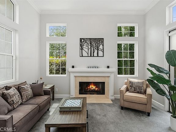 windows, filling every corner. The formal living room greets you with soaring ceilings, a fireplace,