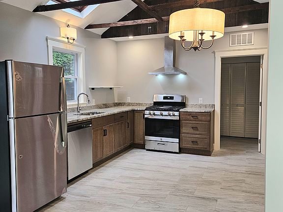 Be the first to live in this fully renovated one-bedroom, one-bath apartment in Hull's historic Village. The home features a brand-new kitchen with a stainless steel gas stove, vent hood, refrigerator, dishwasher, granite countertops, and skylight. The spacious bath includes an in-unit washer/dryer, tankless hot water heater, and linen shelving. Original wood floors were refinished, with new tile in the kitchen and bath. Updated lighting includes coordinated fixtures and pendant lights in the bedroom and living room. Set back from the road, this three-family home offers privacy with a deck, patio, off-street parking, and professionally maintained lawn. The Village playground is across the street, and the MBTA ferry, Jo's Nautical, and Shipwrecked are just blocks away. Trash, recycling, water, sewer, and lawn care included. No pets, smoking, or vaping. First, last, security, credit and background checks required.